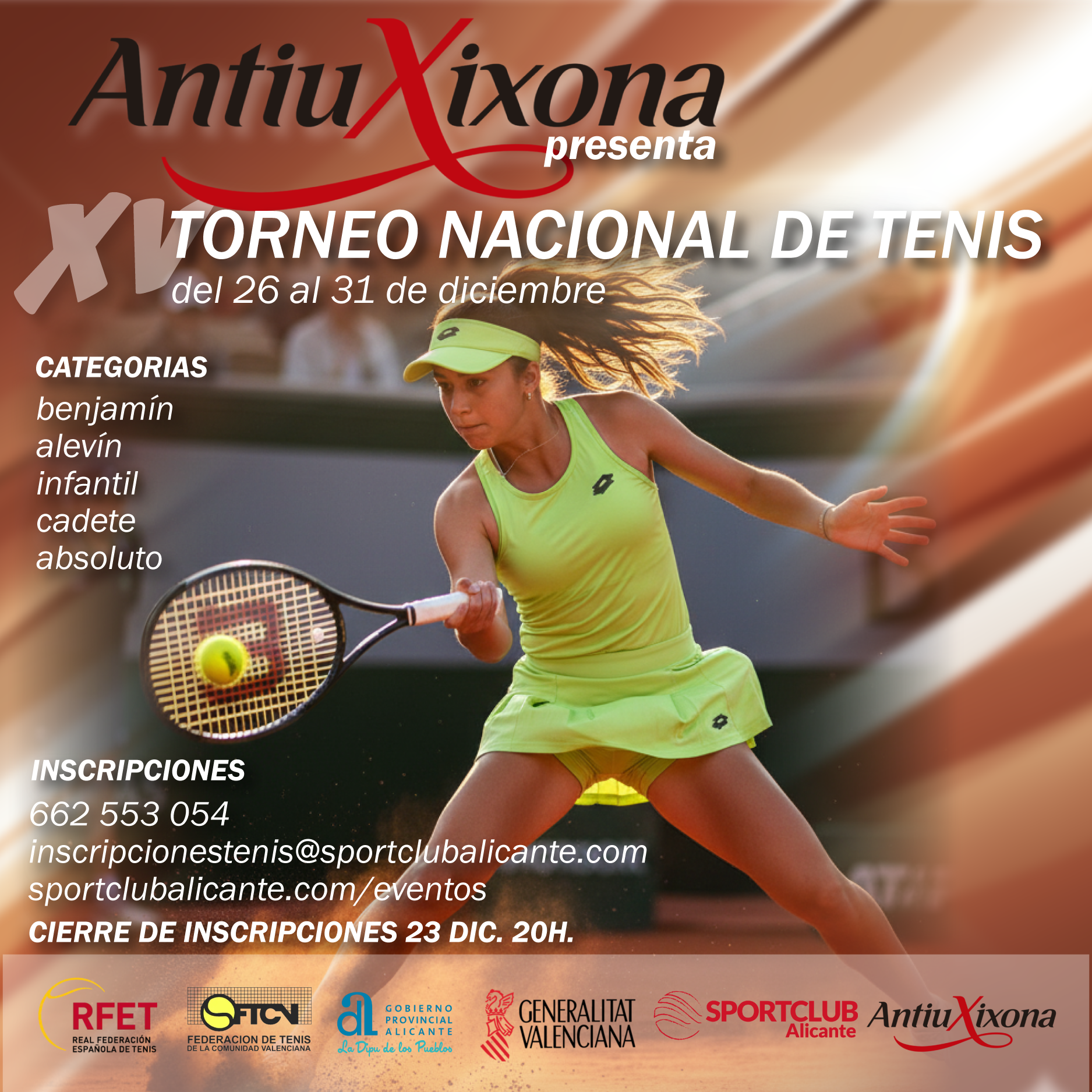 Diputación de Alicante · Real Federación Española de Tenis (RFET) · Federació de Tennis de la Comunitat Valenciana (FTCV) · Generalitat Valenciana · Antiu XixonaContacto para inscripciones: